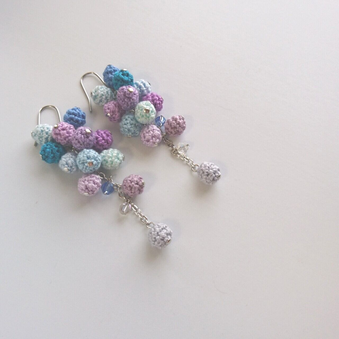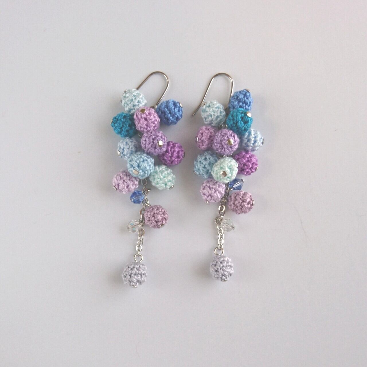 刺繍糸をレース針で球状に編んで綿を詰めた、編み玉 を、左右それぞれ12個ずつ使ったピアス/イヤリングです。