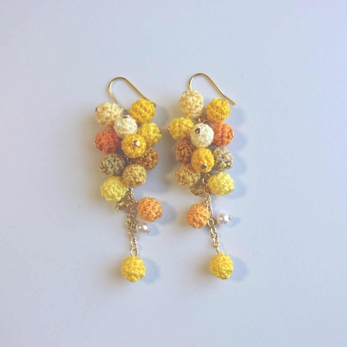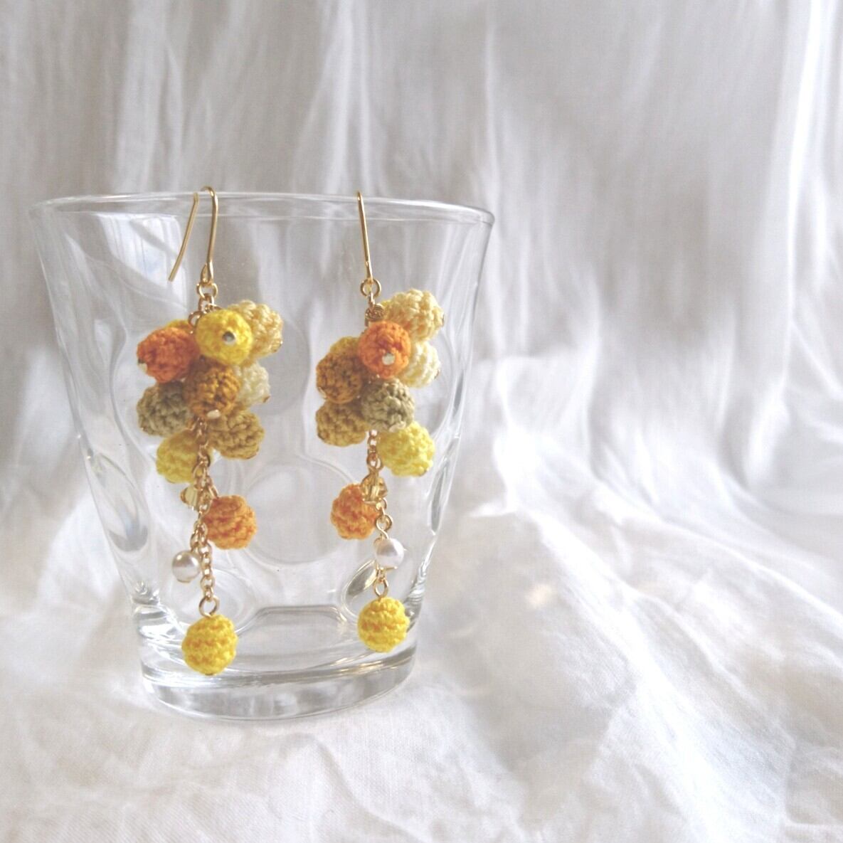 刺繍糸をレース針で球状に編んで綿を詰めた、編み玉 を、左右それぞれ12個ずつ使ったピアス/イヤリングです。