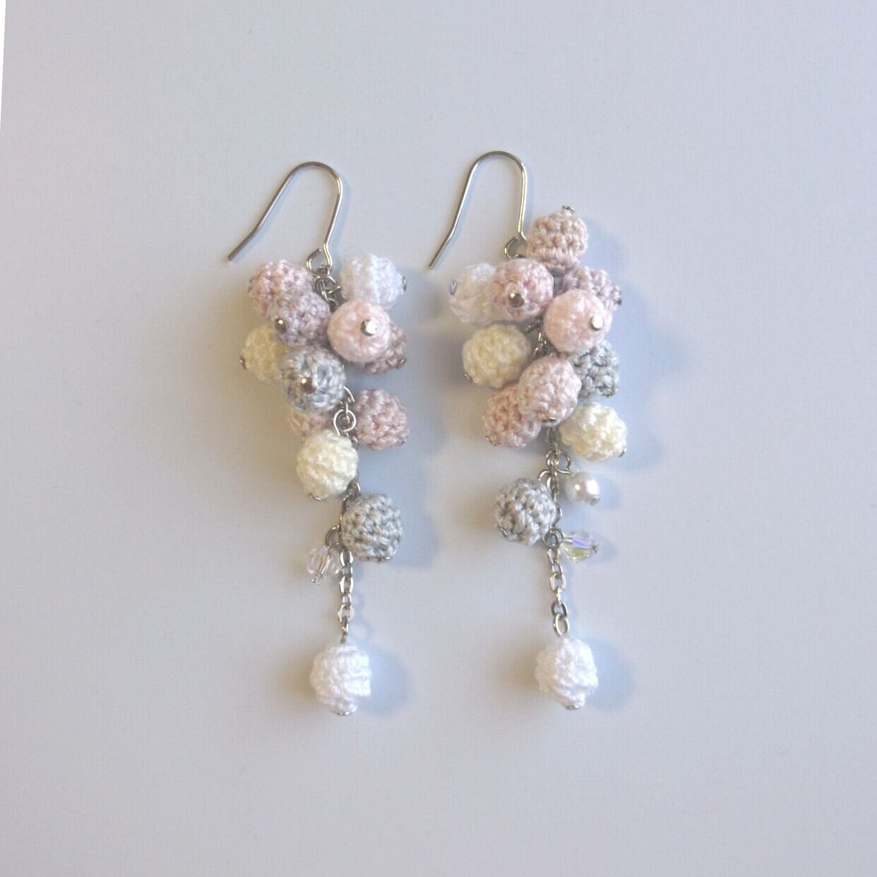 刺繍糸をレース針で球状に編んで綿を詰めた、編み玉 を、左右それぞれ12個ずつ使ったピアス/イヤリングです。