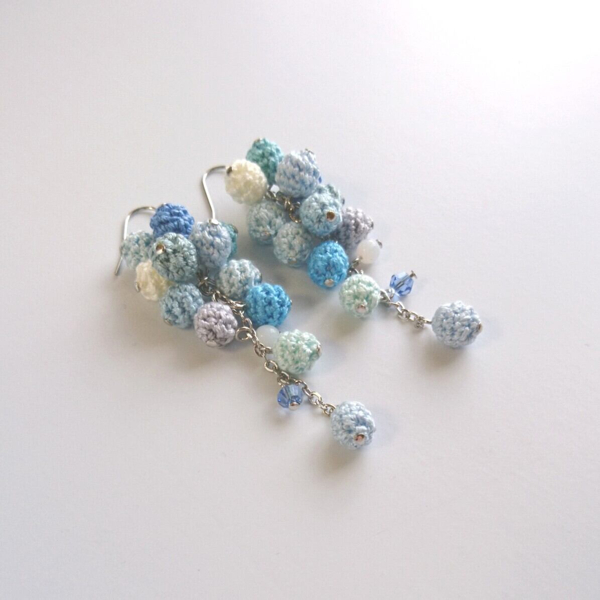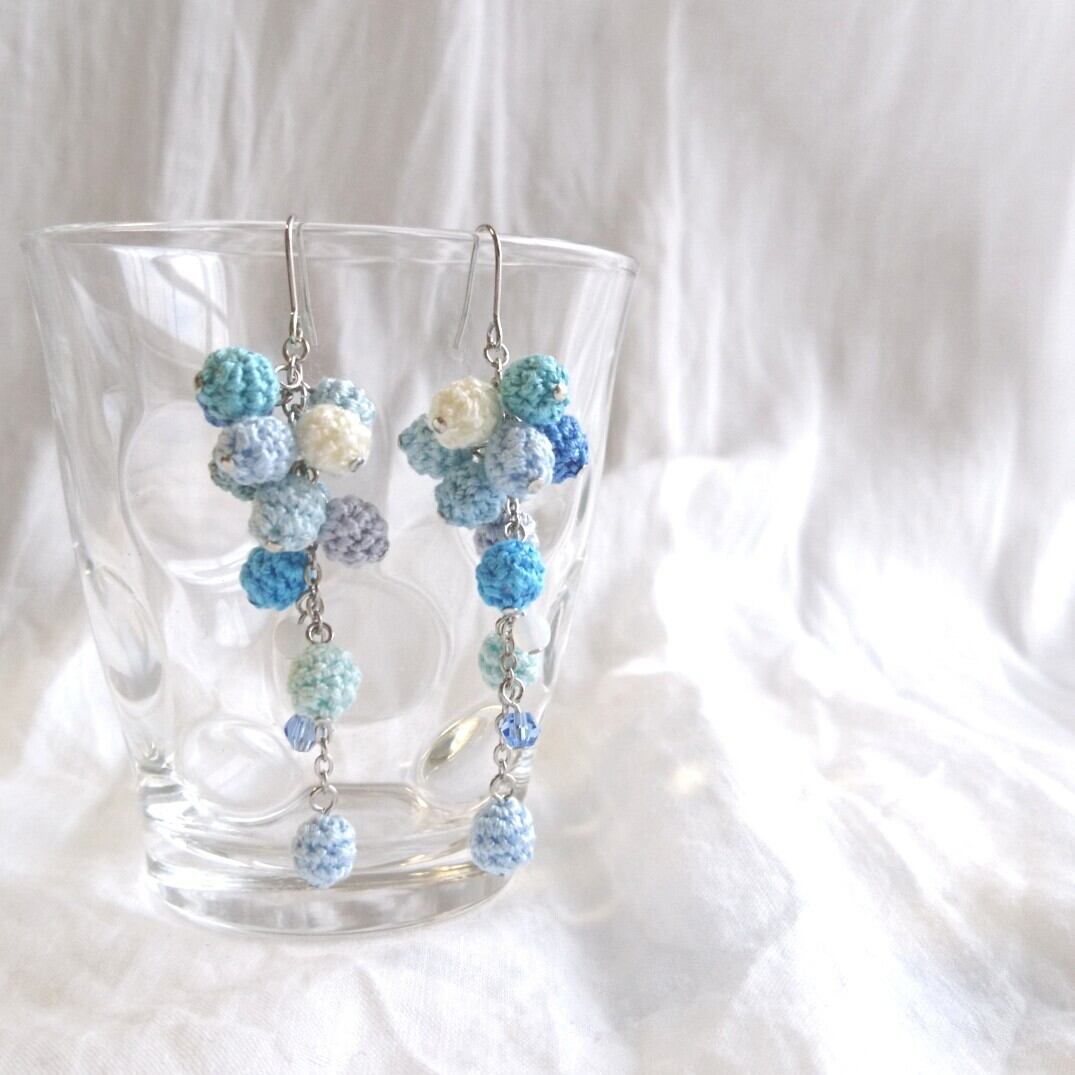 刺繍糸をレース針で球状に編んで綿を詰めた、編み玉 を、左右それぞれ12個ずつ使ったピアス/イヤリングです。