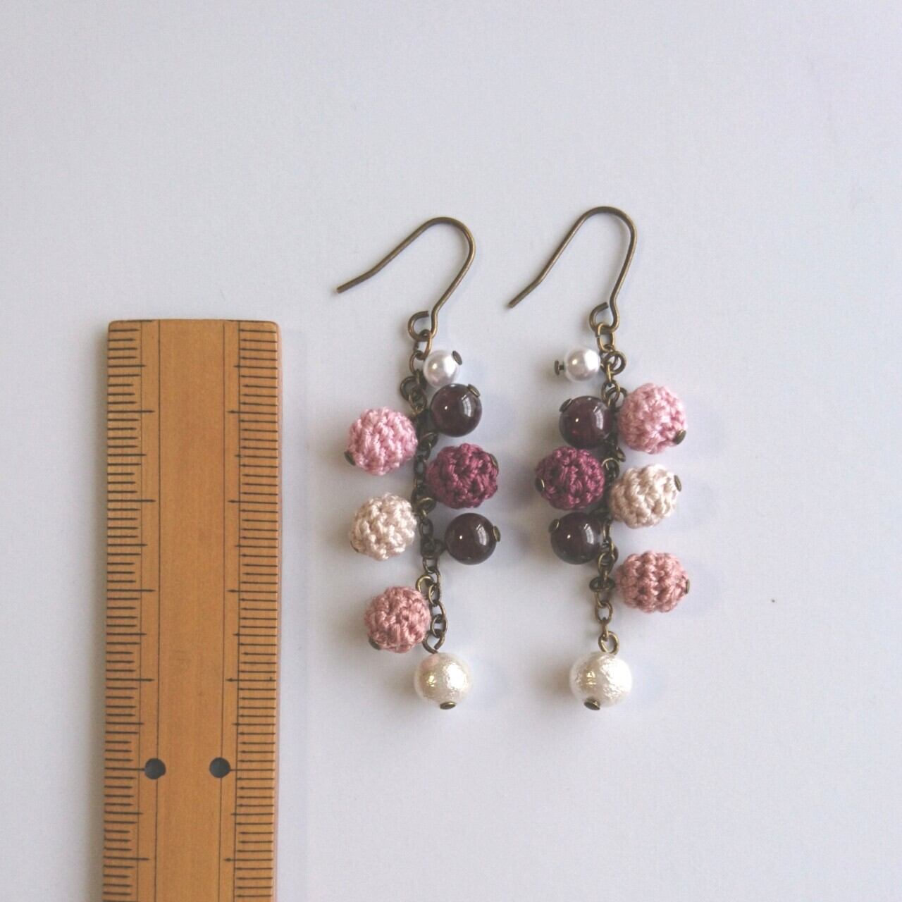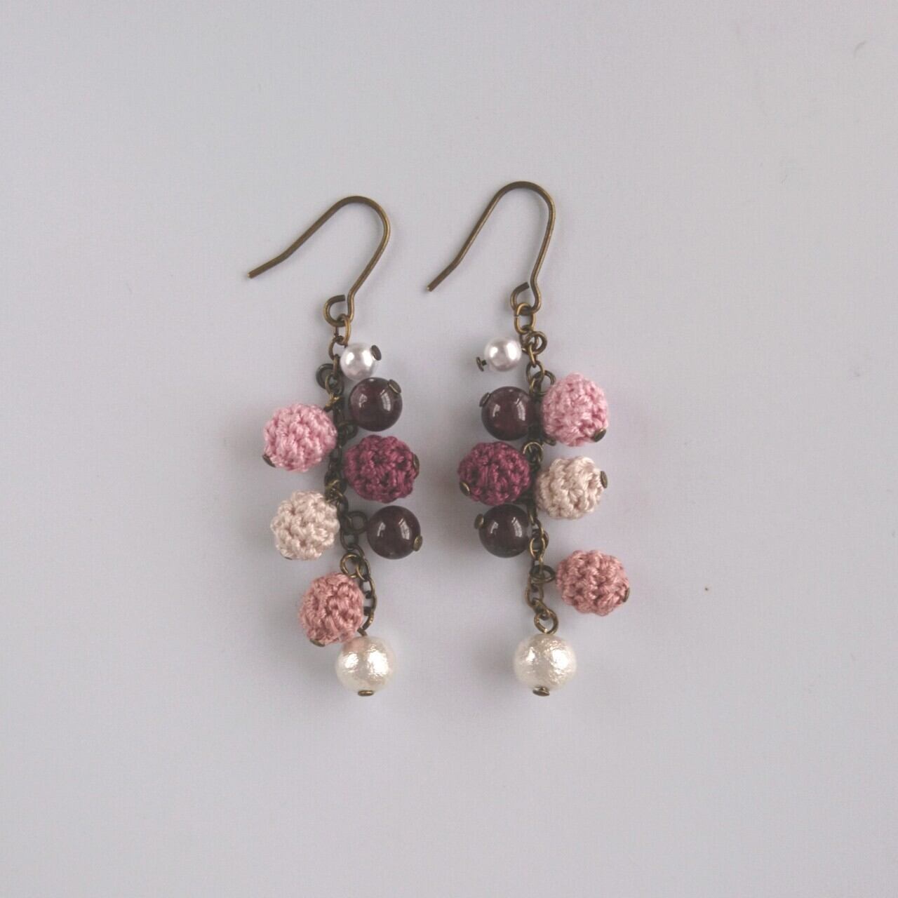 天然石(ガーネット)と編み玉を組み合わせたピアス/イヤリングです。 ピアスorイヤリング、ご希望の金具をオプション欄にて選択してから、カートにお進みください。