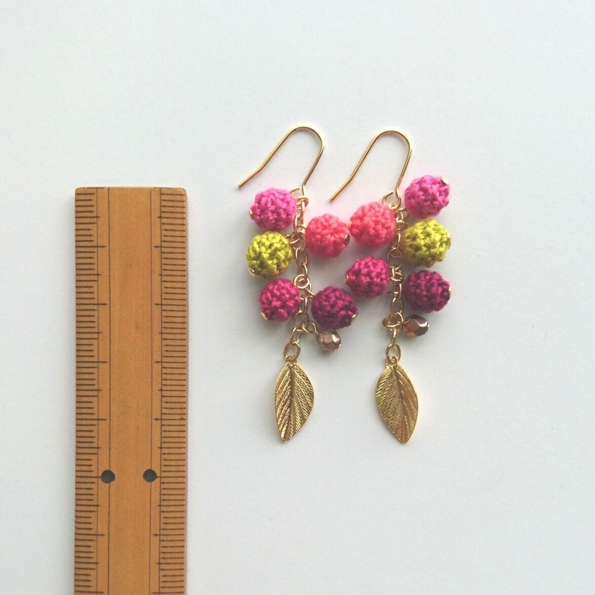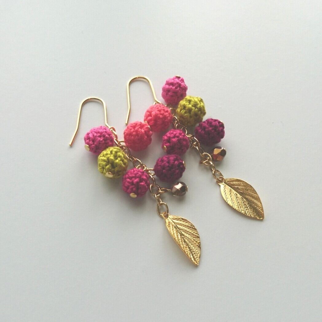 鮮やかな秋色の編み玉を、ゴールドの金具でまとめました。