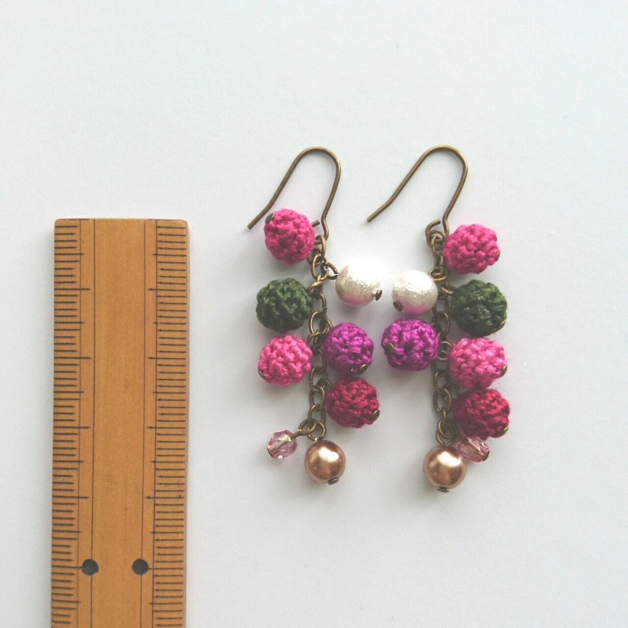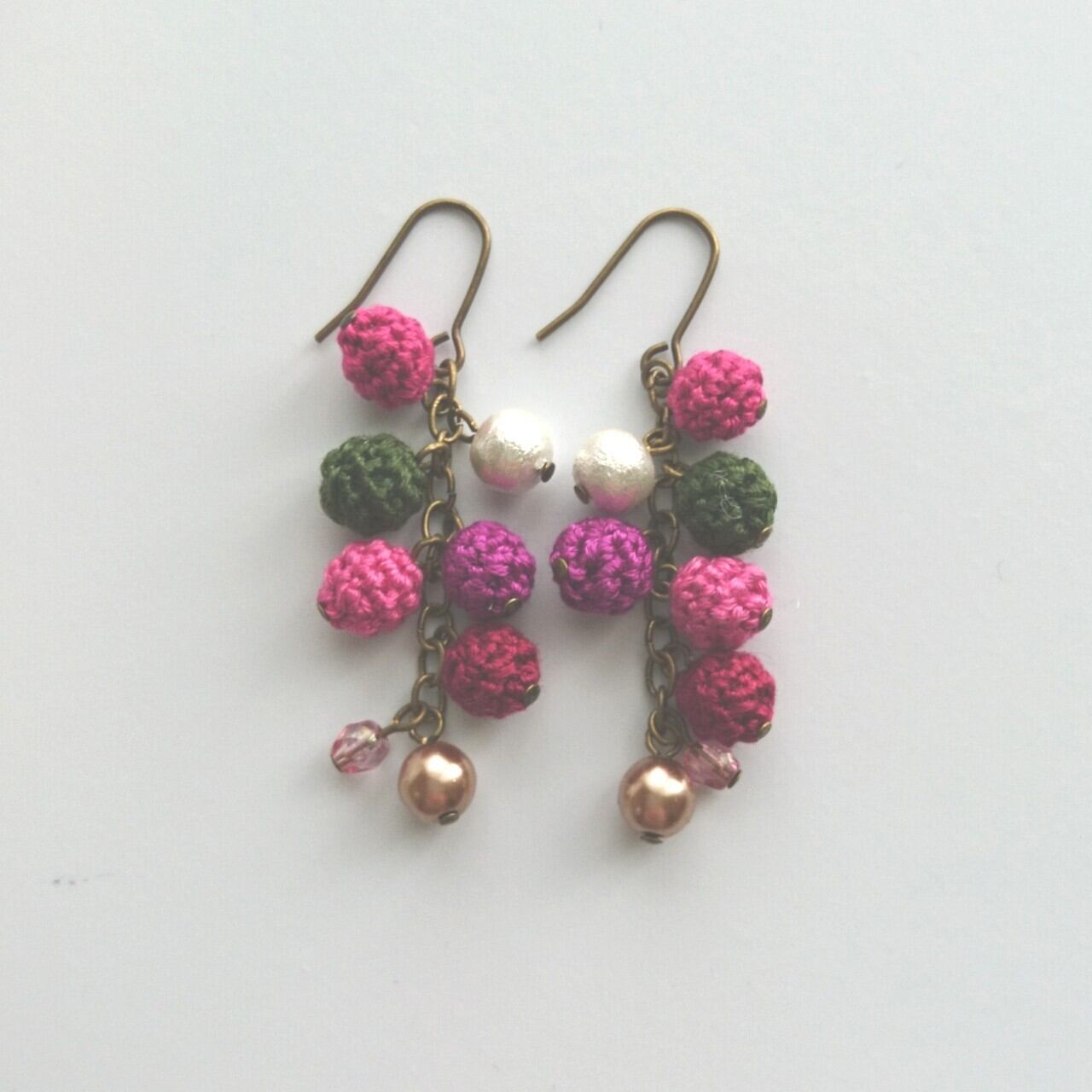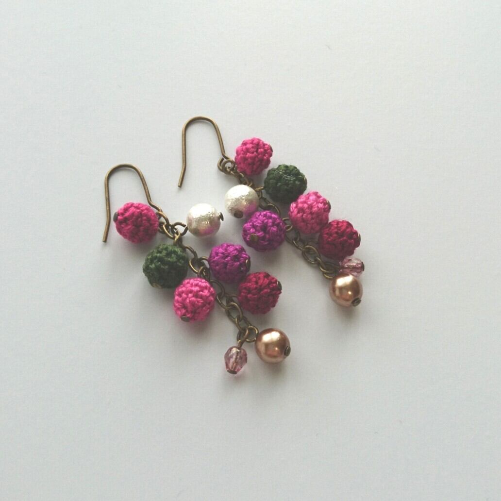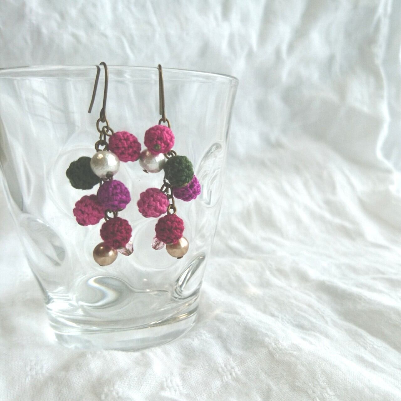 落ち着いた秋色の編み玉を、アンティークゴールドの金具でまとめました。