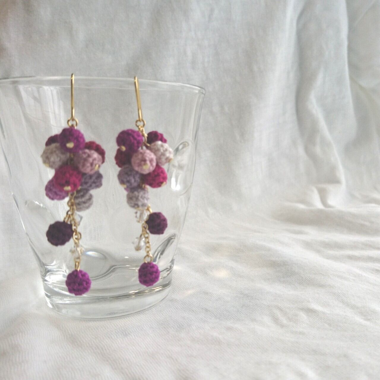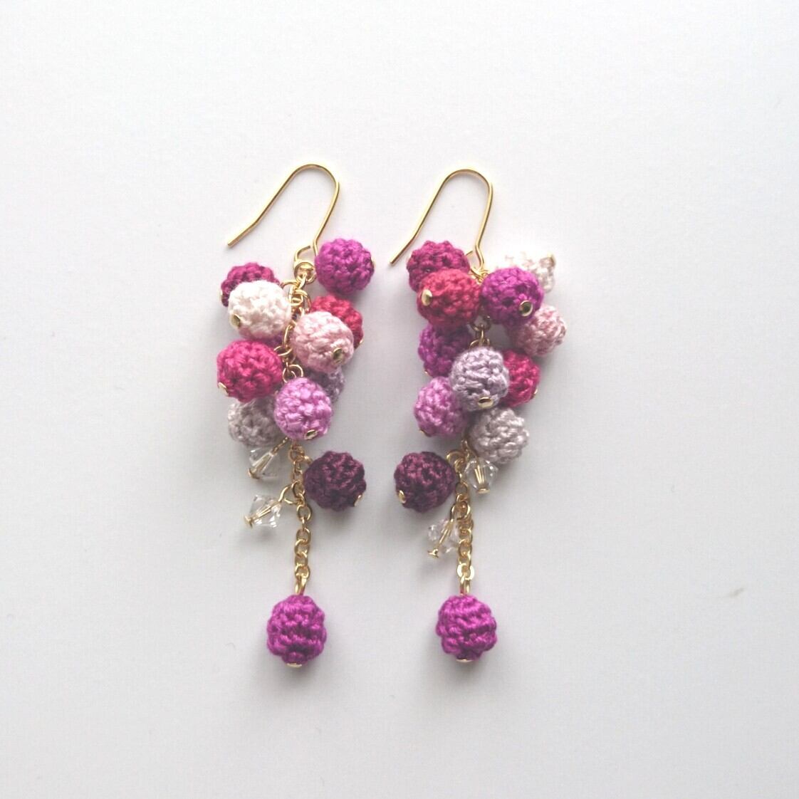 刺繍糸をレース針で球状に編んで綿を詰めた、編み玉 を、左右それぞれ12個ずつ使ったピアス/イヤリングです。