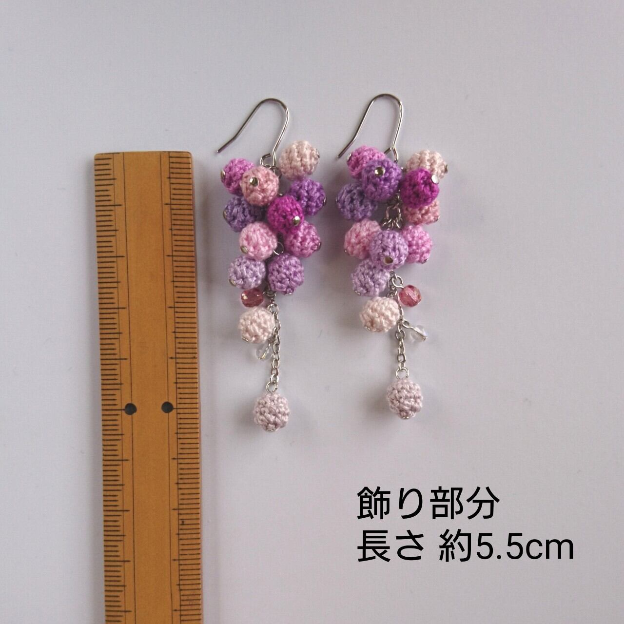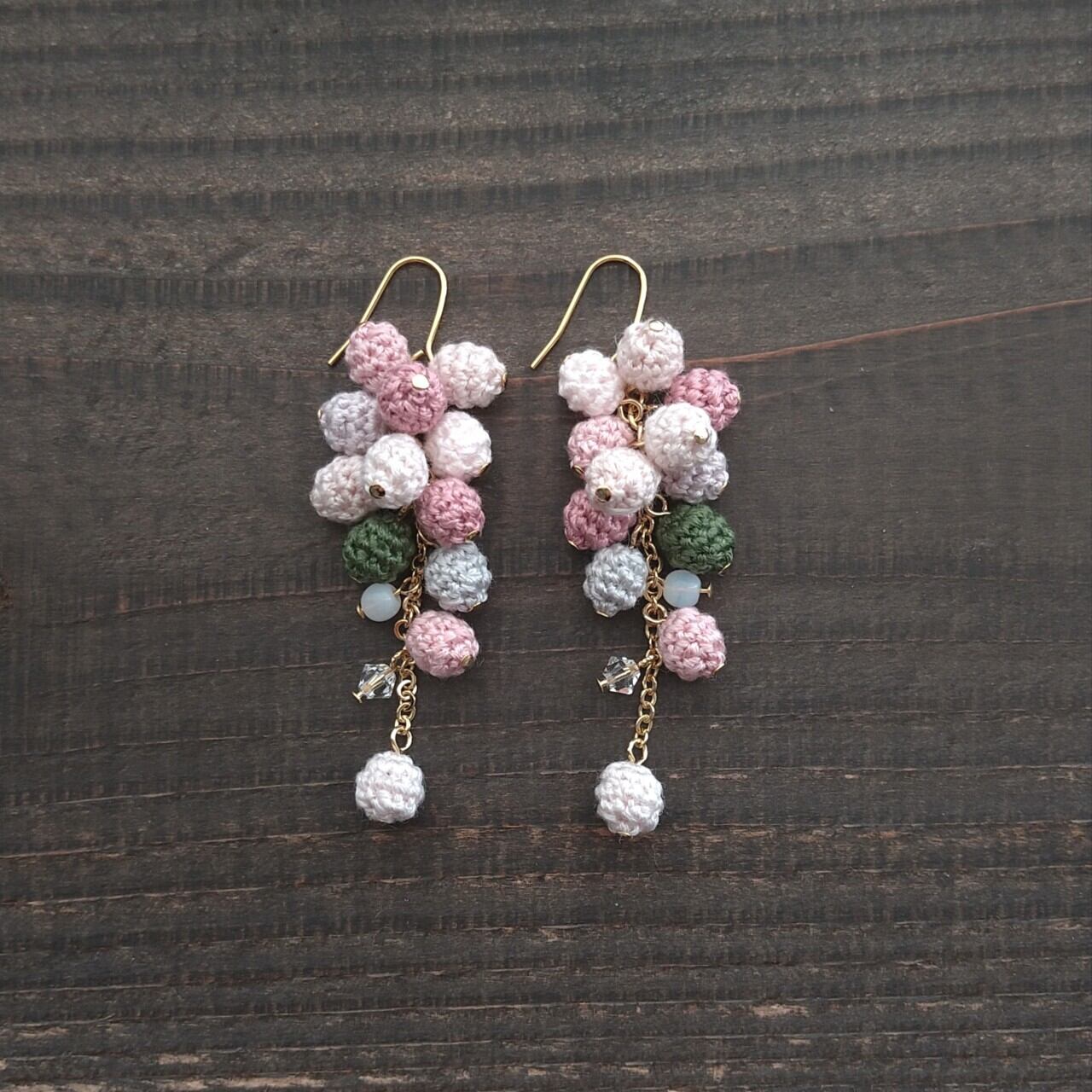 刺繍糸をレース針で球状に編んで綿を詰めた、編み玉 を、左右それぞれ12個ずつ使ったピアス/イヤリングです。